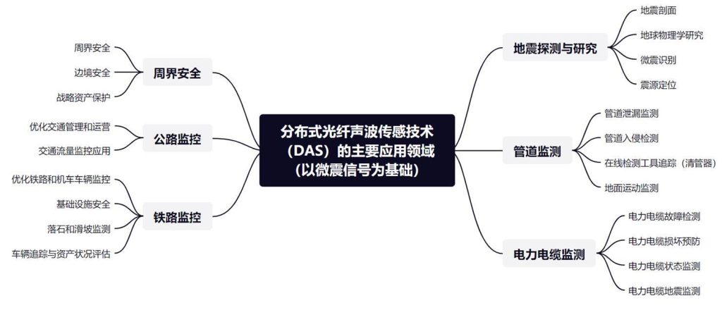 基于光纖的分布式聲波傳感器(DAS)是一種利用光纖中的后向瑞利散射(RBS)來定位和恢復(fù)光纖鏈路上的任意位置處機(jī)械振動(dòng)信息(振幅、相位和頻率)的技術(shù) 。由于機(jī)械振動(dòng)通常能夠在介質(zhì)中傳播很遠(yuǎn),DAS 能夠檢測(cè)遠(yuǎn)離光纖的事件;基于光纖的低損耗特性,傳感光纖的長度可達(dá)數(shù)千米至上百千米,因此 DAS 系統(tǒng)的探測(cè)覆蓋范圍非常廣;DAS 的振動(dòng)檢測(cè)帶寬可高達(dá)數(shù)十千赫茲,可以包含待測(cè)事件的豐富信息 ;傳感光纜具有本征安全、抗電磁干擾、耐惡劣環(huán)境等優(yōu)勢(shì)。這些優(yōu)點(diǎn)使得 DAS 在周界圍欄安防、管道安全監(jiān)測(cè)、井下資源勘探等長距離應(yīng)用領(lǐng)域中有著巨大的應(yīng)用潛力,并且其應(yīng)用領(lǐng)域仍在不斷拓展中。